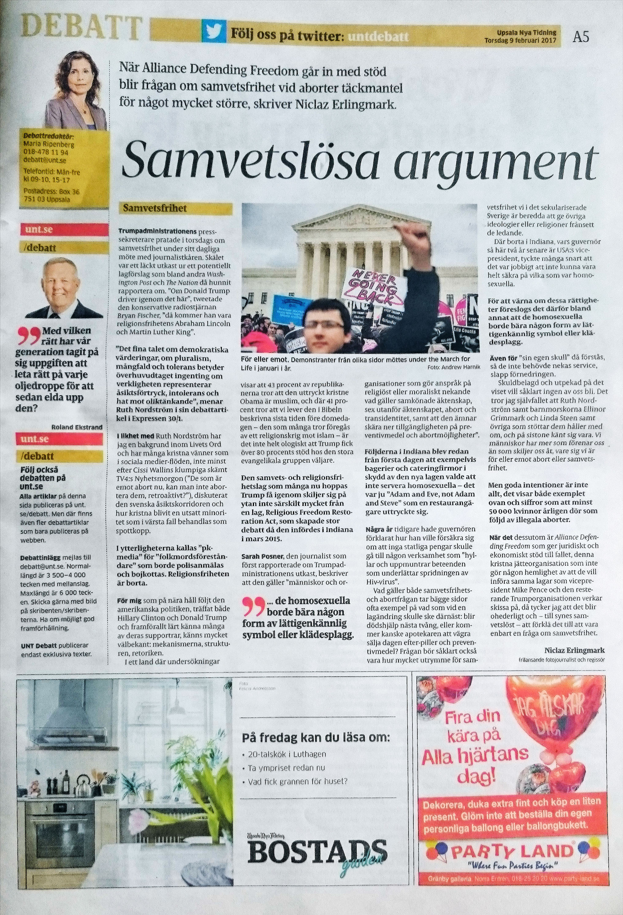 > ' S A M V E T S L Ö S A A R G U M E N T ', artikel, februari 2017, jpg. Blev trött på att nästan dagligen läsa Facebook-kommentarer om hemska barnamördare som "rips the babies out of the vagina" och liknande, och förstod snart att jag inte skulle kunna hålla mig ifrån att gå in i debatten kring den barnmorska som blivit mångas hjälte. Ett svårt ämne förstås, ett jag diskuterat många gånger i andra fora, och som den här gången främst störde mig vad gäller uppriktigheten och motiven. Ofta är det ju nämligen samma gäng som gärna klagar över andras religionsfrihet som själva kräver detsamma. För Upsala Nya Tidning där den också finns online.